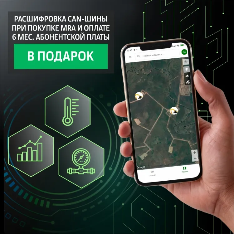 Акция действует при покупке телематической системы MRA и внесении предоплаты за 6 месяцев абонентской платы. При выполнении этих условий клиент получает расшифровку CAN-шины машины бесплатно (включая сбор параметров, первичную калибровку и привязку к рабочим режимам).